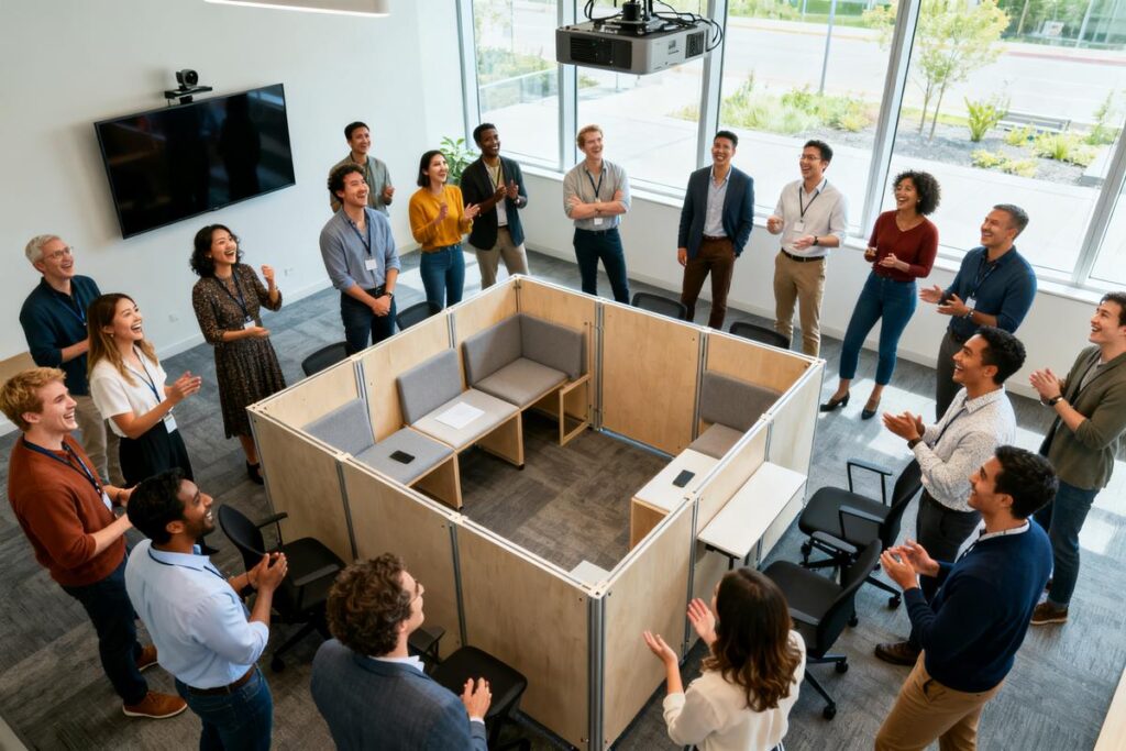 La modularité améliore le confort et la productivité : isolation acoustique ciblée, équipements audiovisuels intégrés et accessibilité PMR. Pour vos équipes, l’avantage se traduit par moins d’interruptions et une meilleure qualité d’accueil des clients. Sur le plan RH, un espace adaptable soutient le travail hybride et favorise la collaboration.